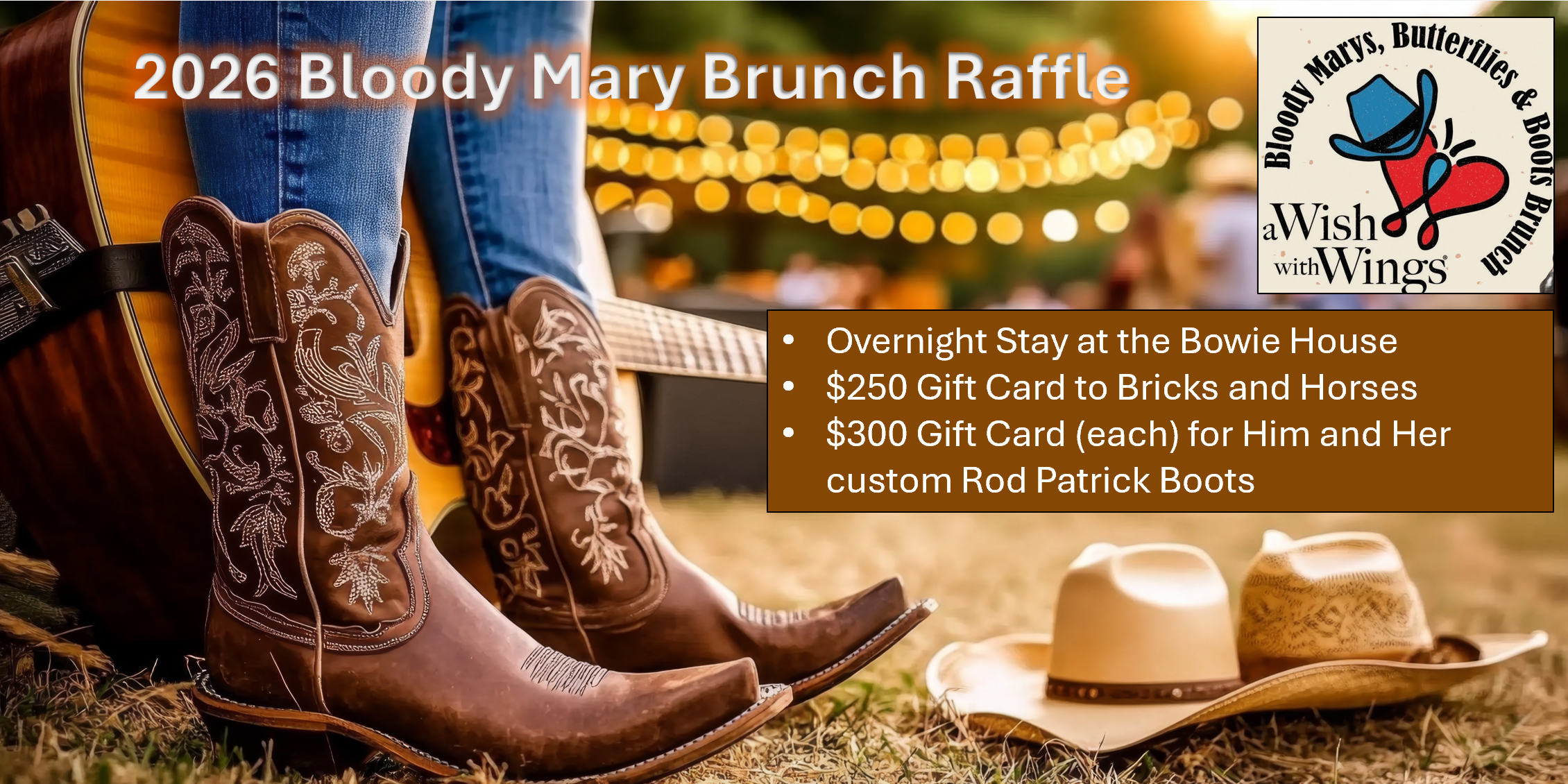 2026 Bloody Mary Brunch Raffle includes: Overnight stay at the Bowie House $250.00 Gift Card to Bricks & Horses $300.00 Gift Card (each) Him & Her Custom Rod Patrick Boots